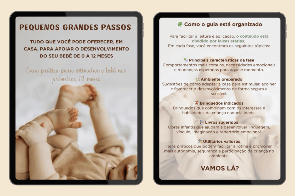 Um material de 30 páginas que te mostra exatamente o que seu filho precisa do 0 aos 12 meses com foco no desenvolvimento saudável .